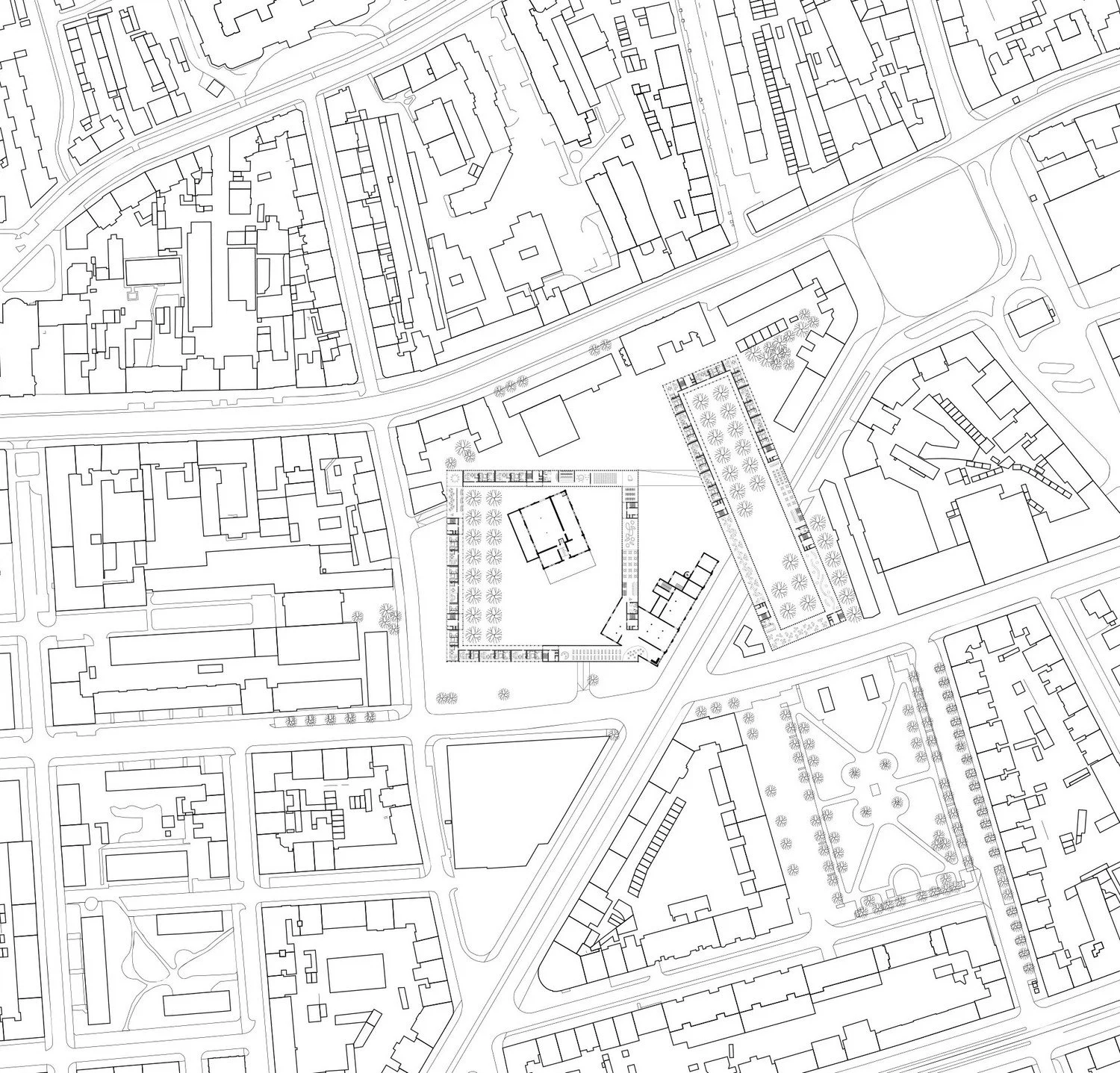 The city of Zagreb invited de baes architects to a master plan to build out the last undeveloped site in the Lower City, a previously industrial complex with several standing—but abandoned—industrial buildings. The Lower City is a densely built residential and commercial neighbourhood at the periphery of the city centre that arose in the 19th century. Perimeter block buildings with square and rectangular plans define the area, and our site was the last remaining unbuilt space in the district.