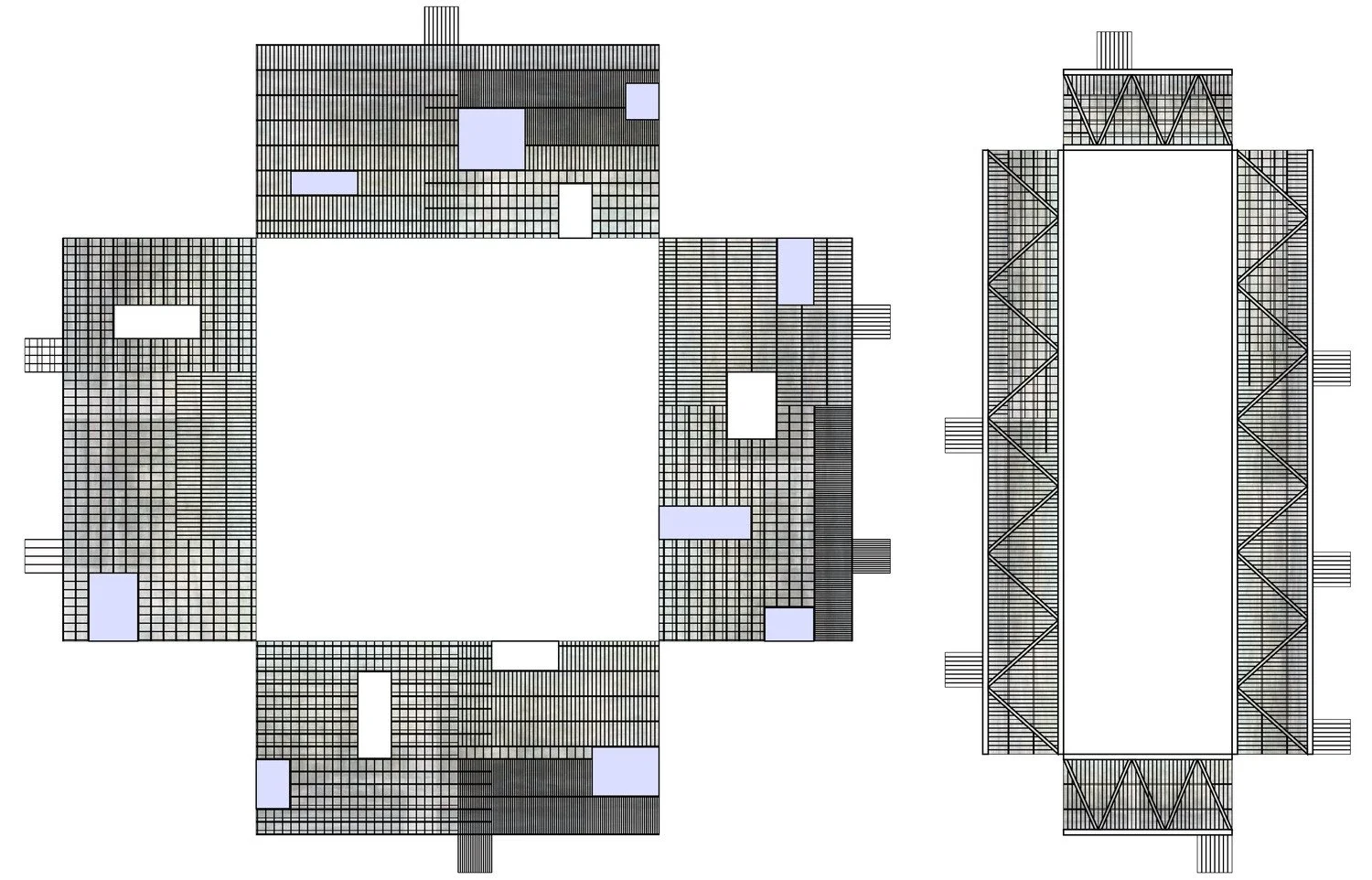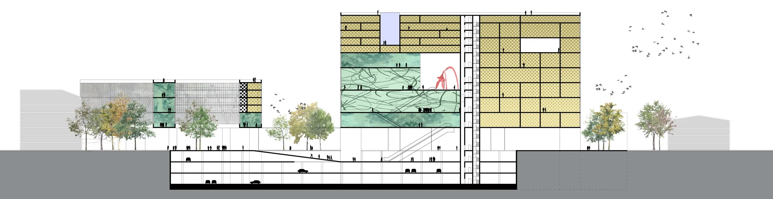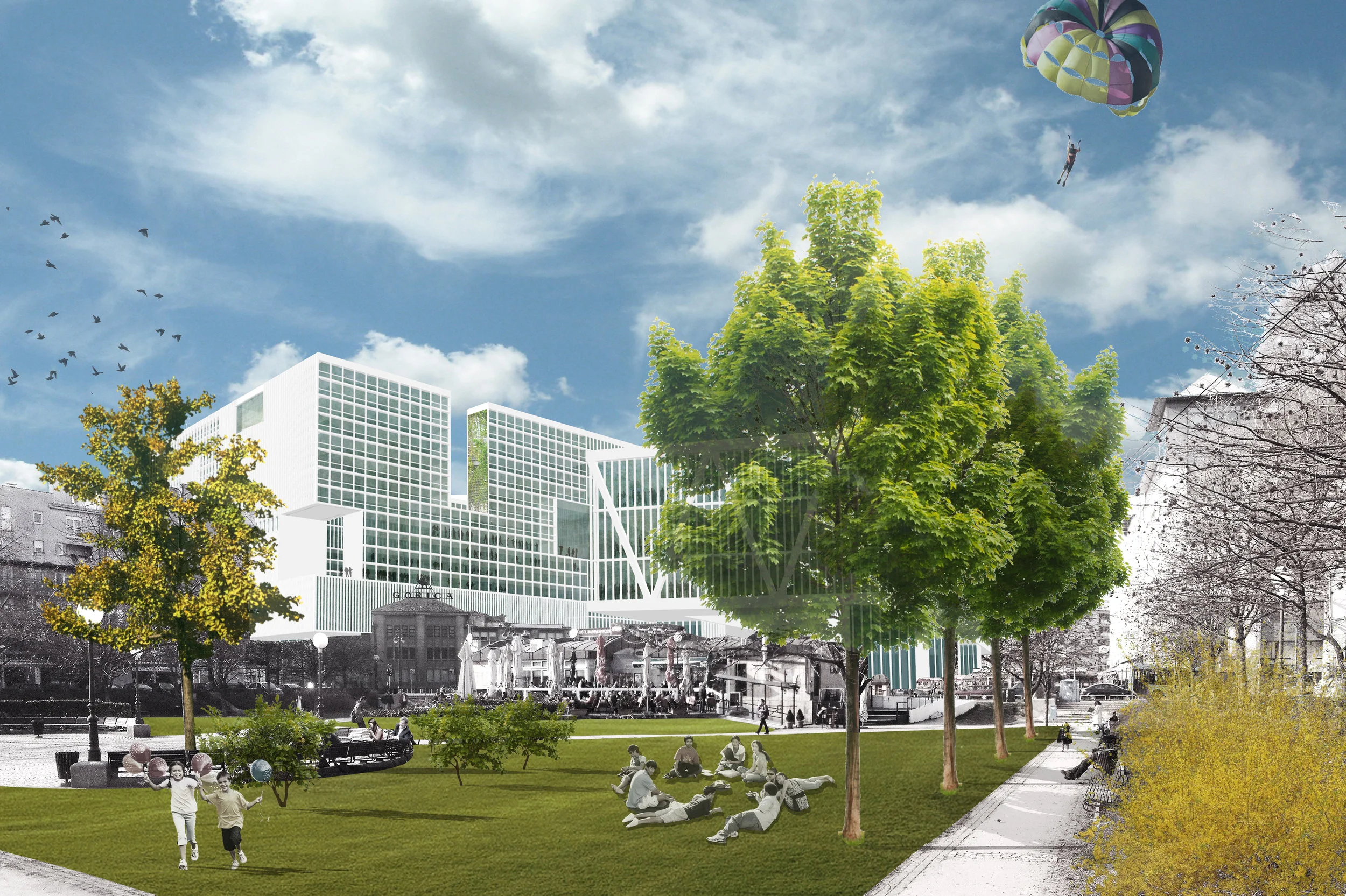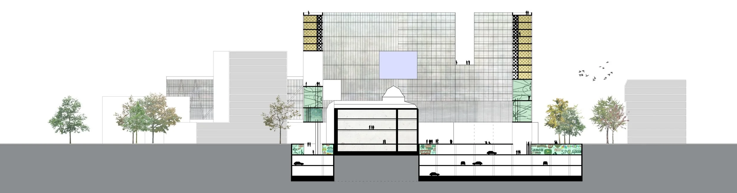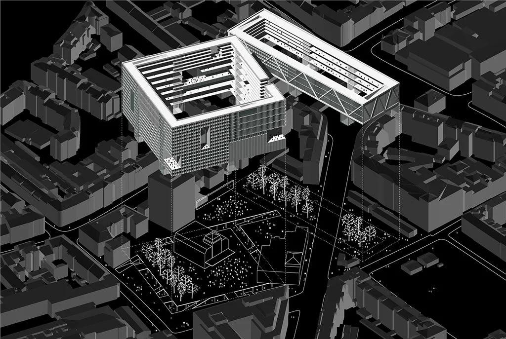The floating buildings act as inhabited membranes, delineating the new squares while maintaining fluid connections with the surrounding city. Openings at the base are oriented towards existing traffic corridors and frame views of the retrofitted heritage structures. Lifted above the ground, the first levels of the new buildings host an elevated promenade lined with retail. Above this are residential floors that command views over the squares and city. The facades articulate these different programs with a rhythm of denser and sparser mullion patterns that optimize natural lighting, views, heating, and cooling for each program. Parking occupies underground levels to keep a pedestrian-friendly ground level free of vehicular traffic.
