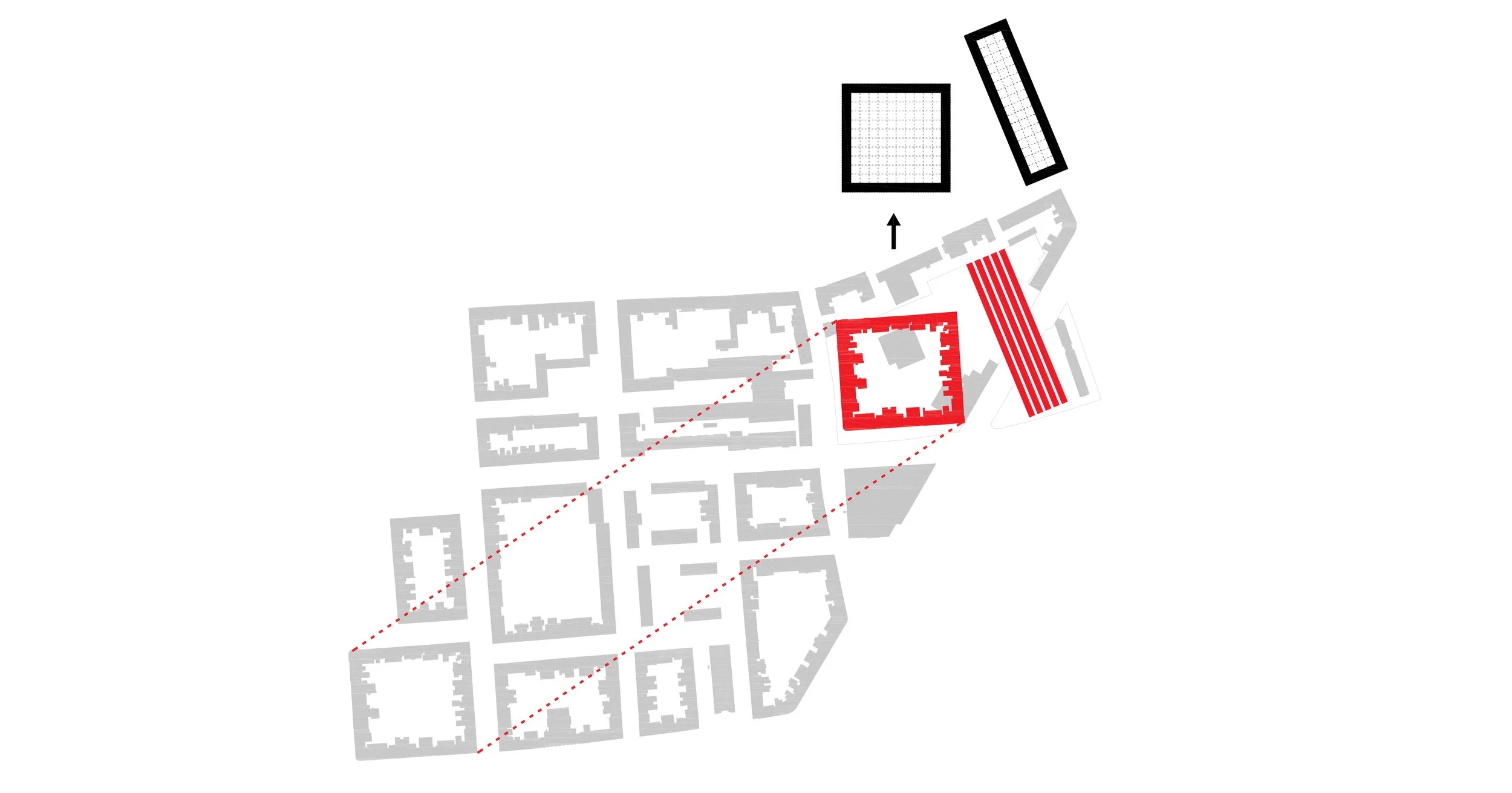Our plan extends this urban fabric, inserting two new floating perimeter block buildings that enclose public squares and highlight the heritage structures. The new buildings are lifted off the ground level, hovering above the 19th-century structures at the perimeter and plugging the new development into the city's existing circulation networks. In all, the plan adds 65,000m² of built area while generating active public spaces, preserving the heritage buildings, and continuing the area's perimeter block character across the abandoned site.