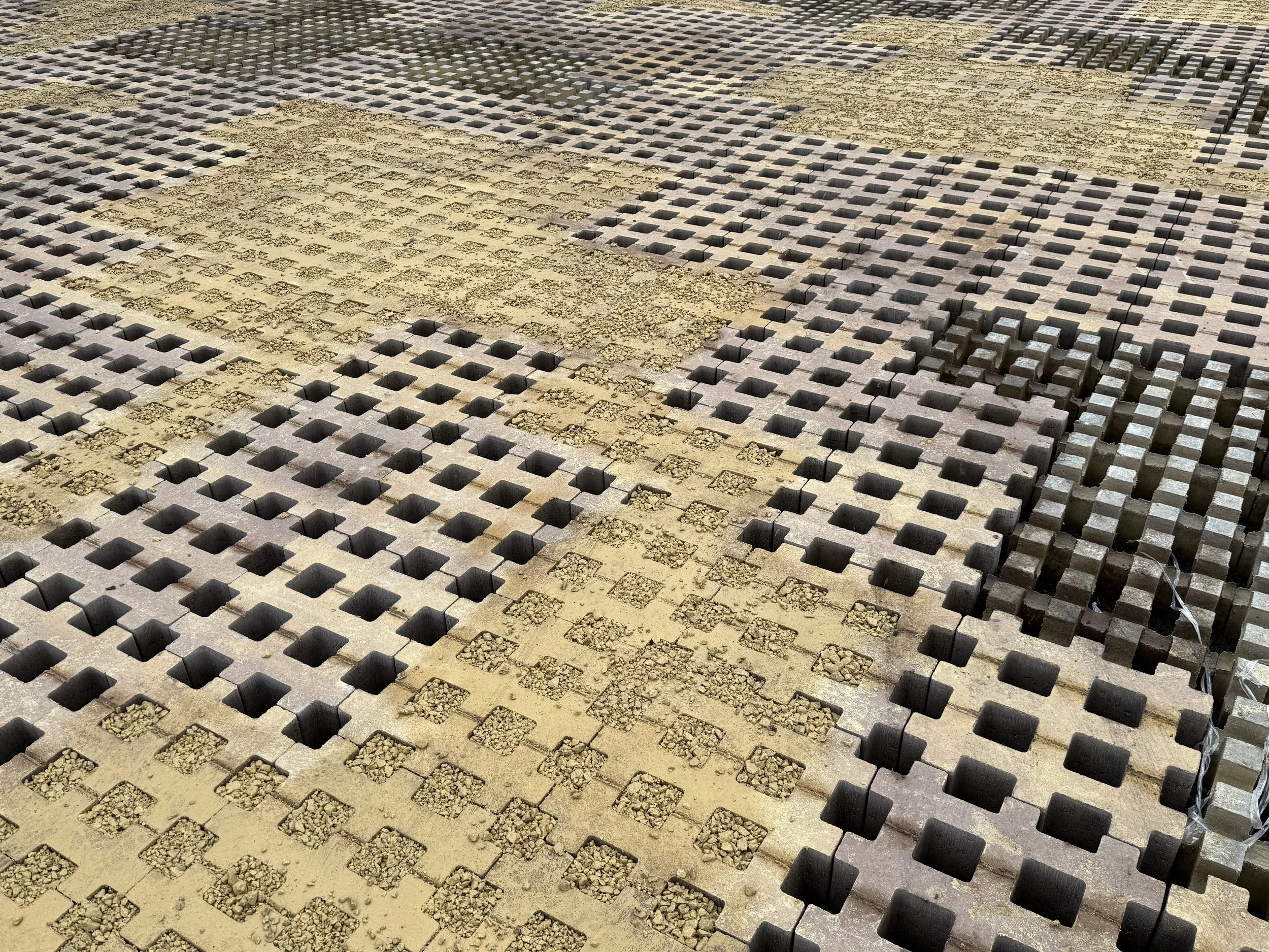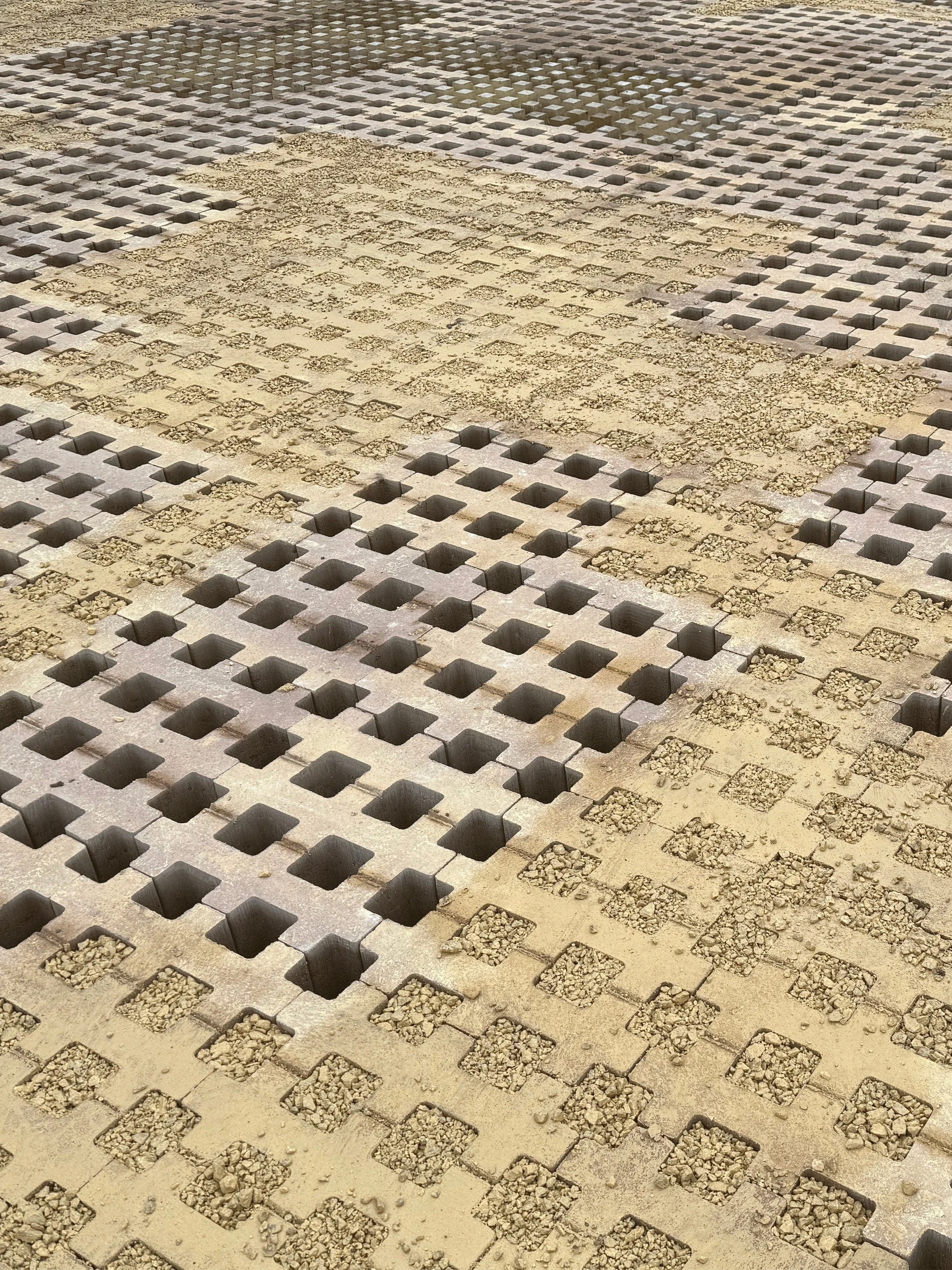 To accommodate parking without paving the entire site, we designed a non-hierarchical landscape that blurs the distinction between places for stay and movement. The design invites people to use connective spaces as places to hang out and to find their own paths on a network of loosely defined connections between buildings, parking spaces, and the landscape. Pixelated pavers embedded into the ground allow grass to grow between them, creating a space halfway between landscape and hardscape parking lot. The result is an inviting, green space where children can play during the day when it usually empties of cars.