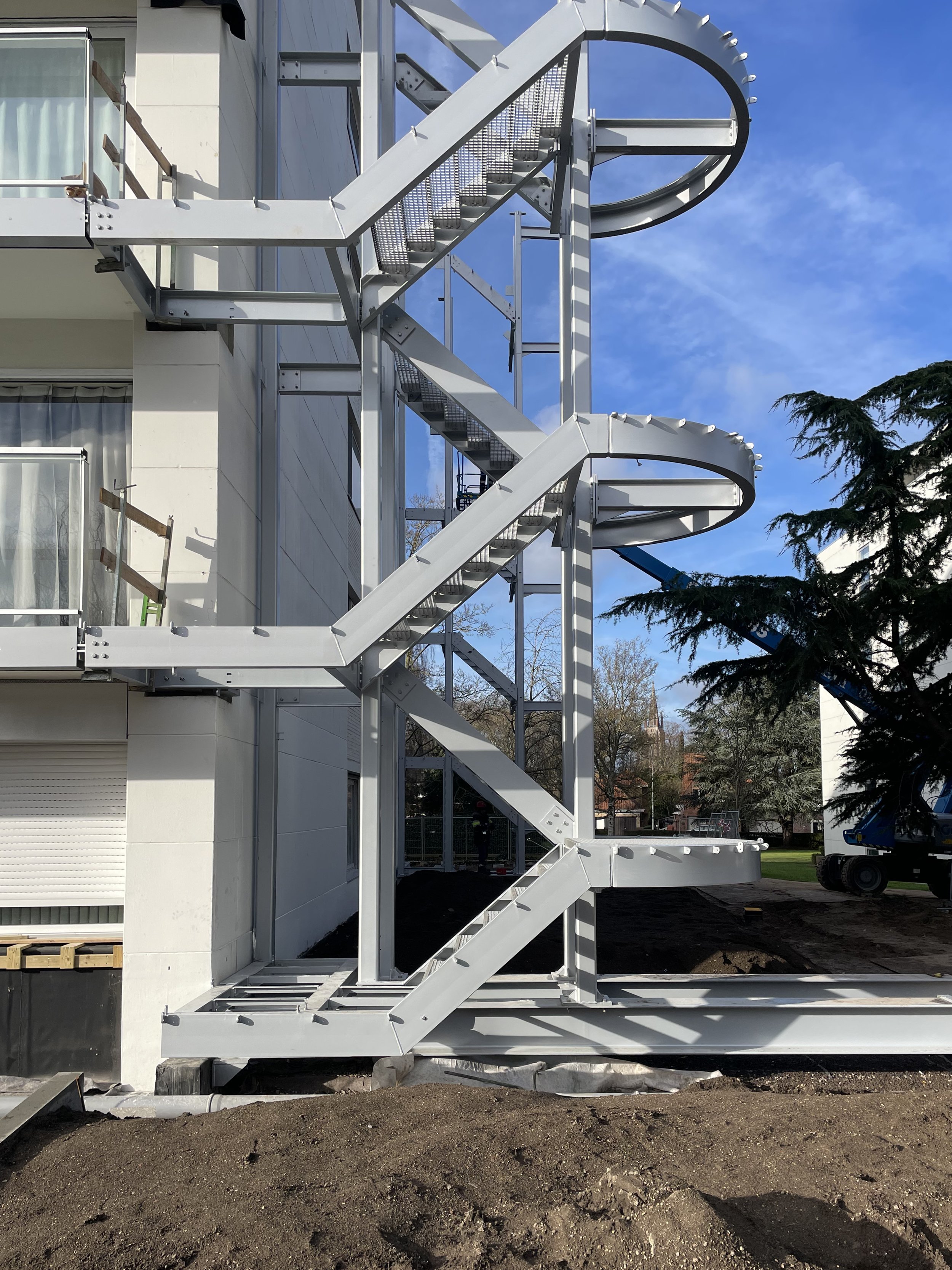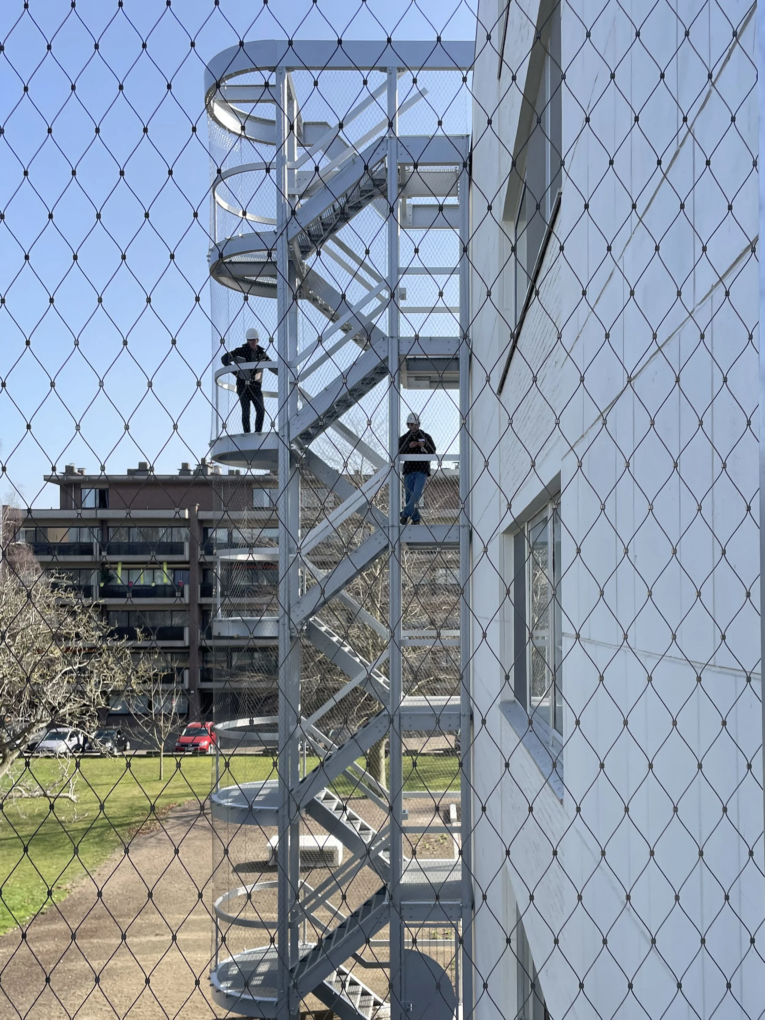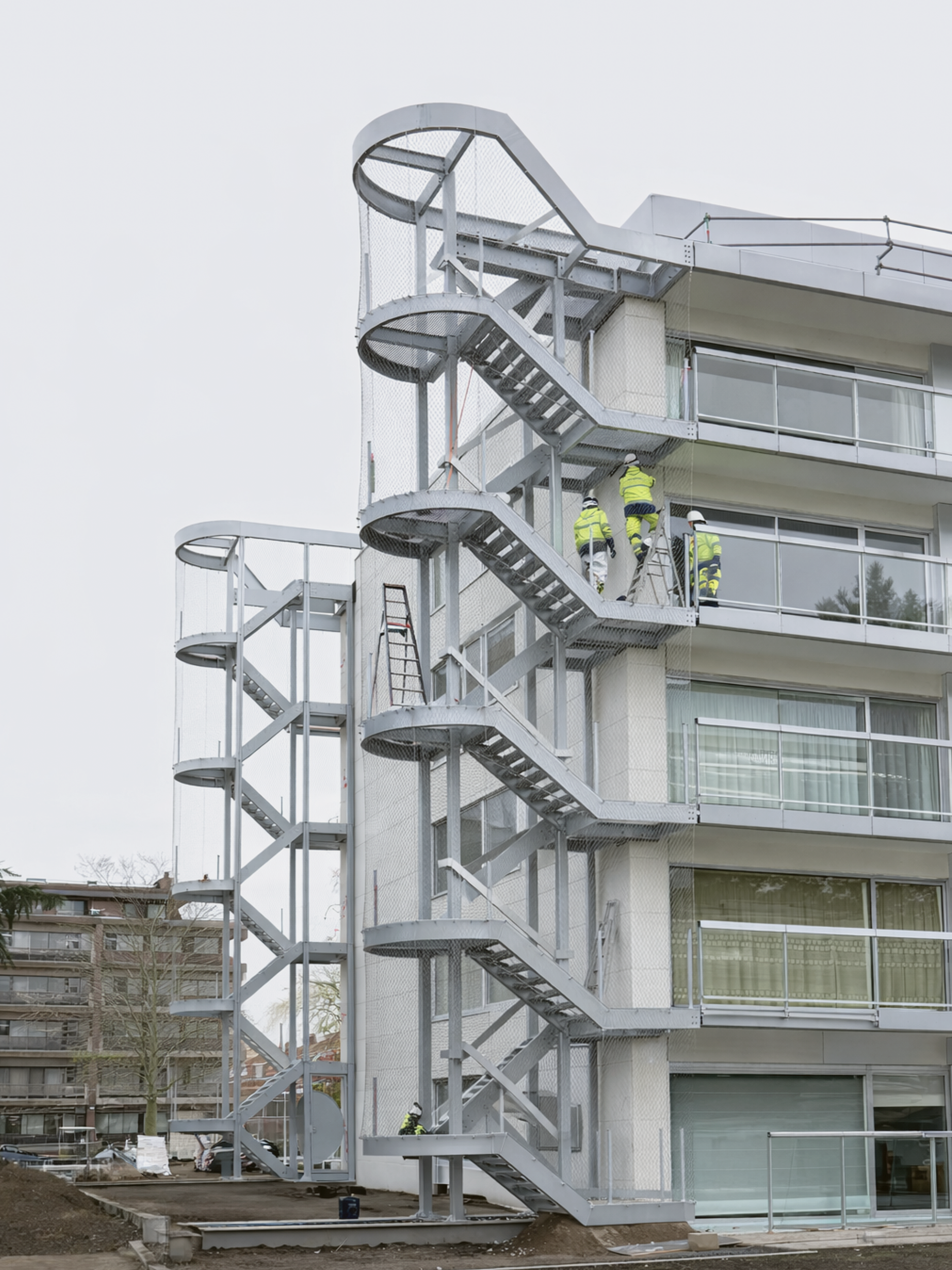 We approached the project as an opportunity to enhance the building and surrounding landscape while fulfilling the utilitarian brief. In addition to a total shell renovation, we designed a rounded metal box stair structure that adds fire escape routes cost-effectively and acts as an architectural insertion that lends a contemporary edge to the post-war building. The materials for the facade and stair are light and reflect the green colours of the surrounding landscape, blending and embedding the building with its context.