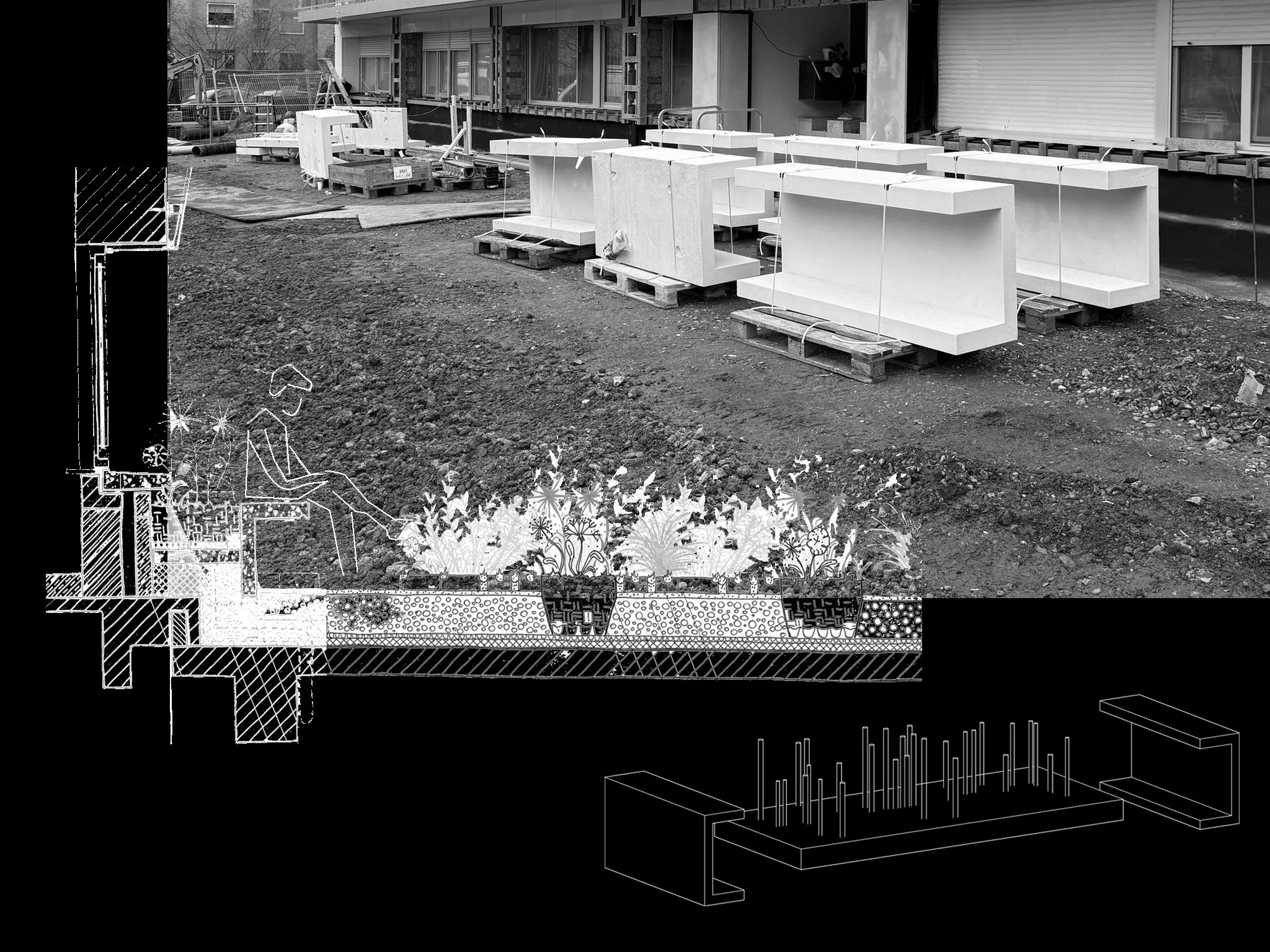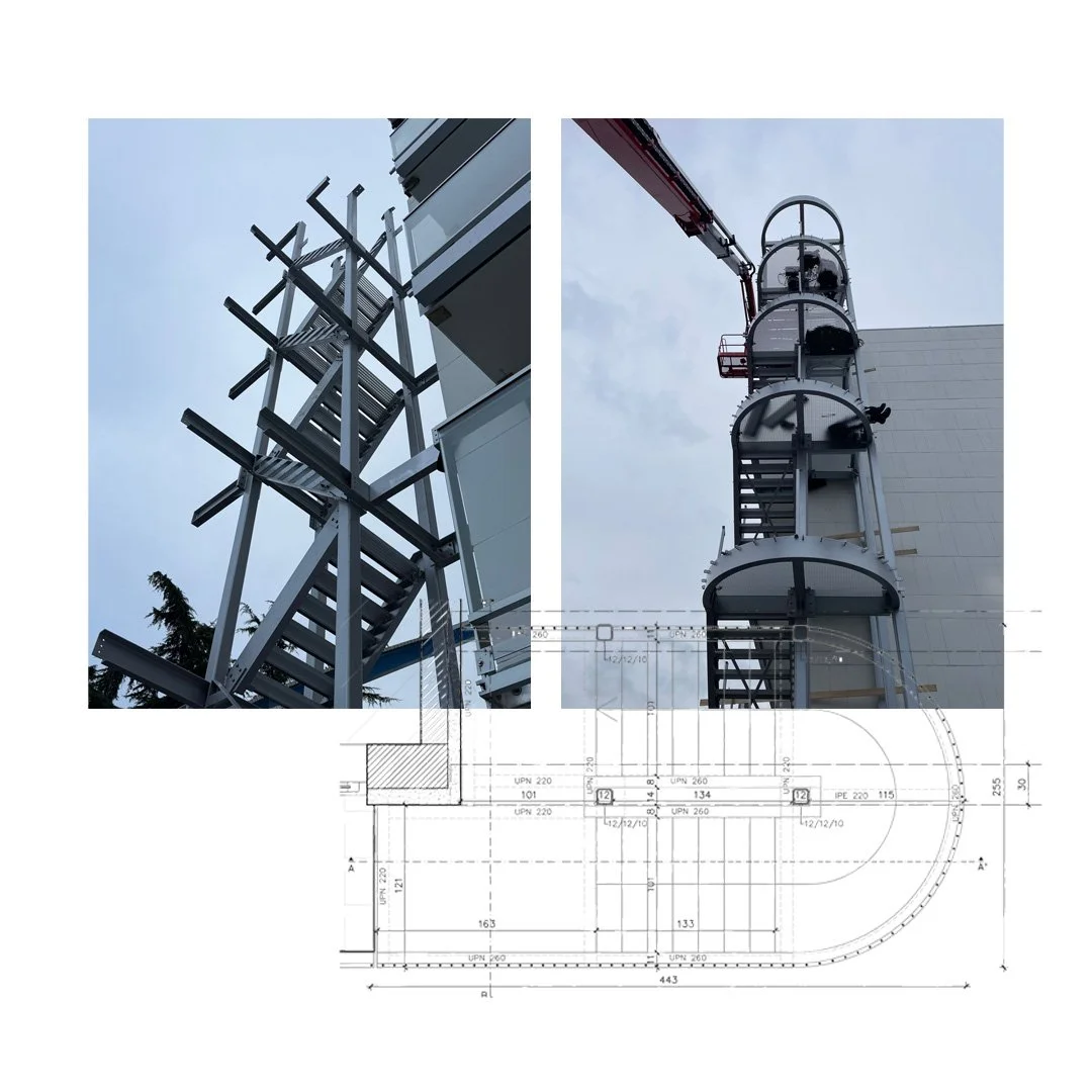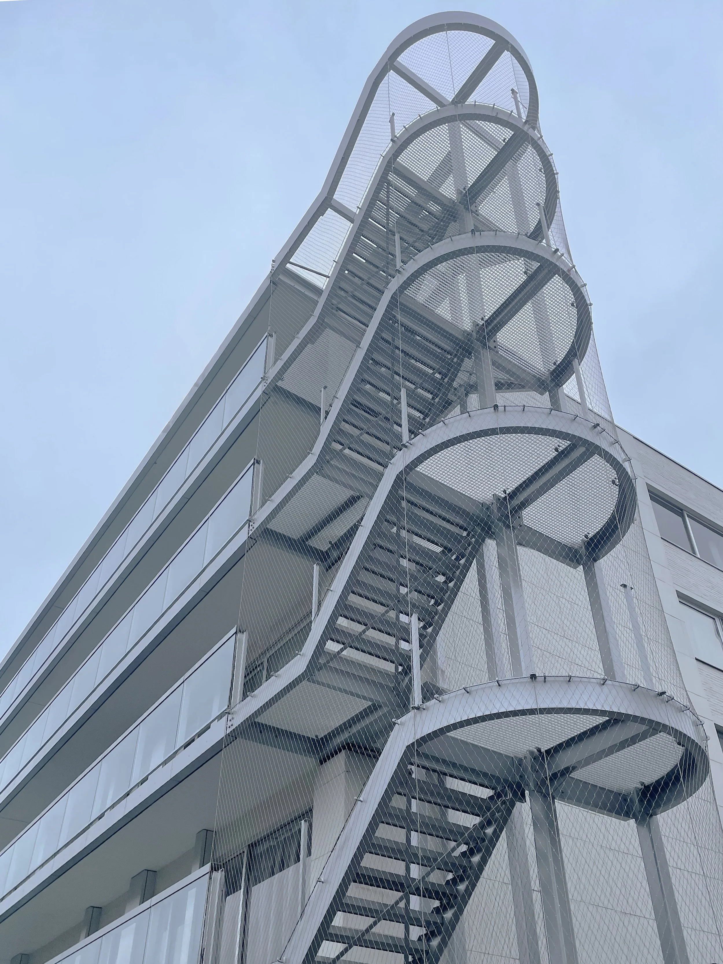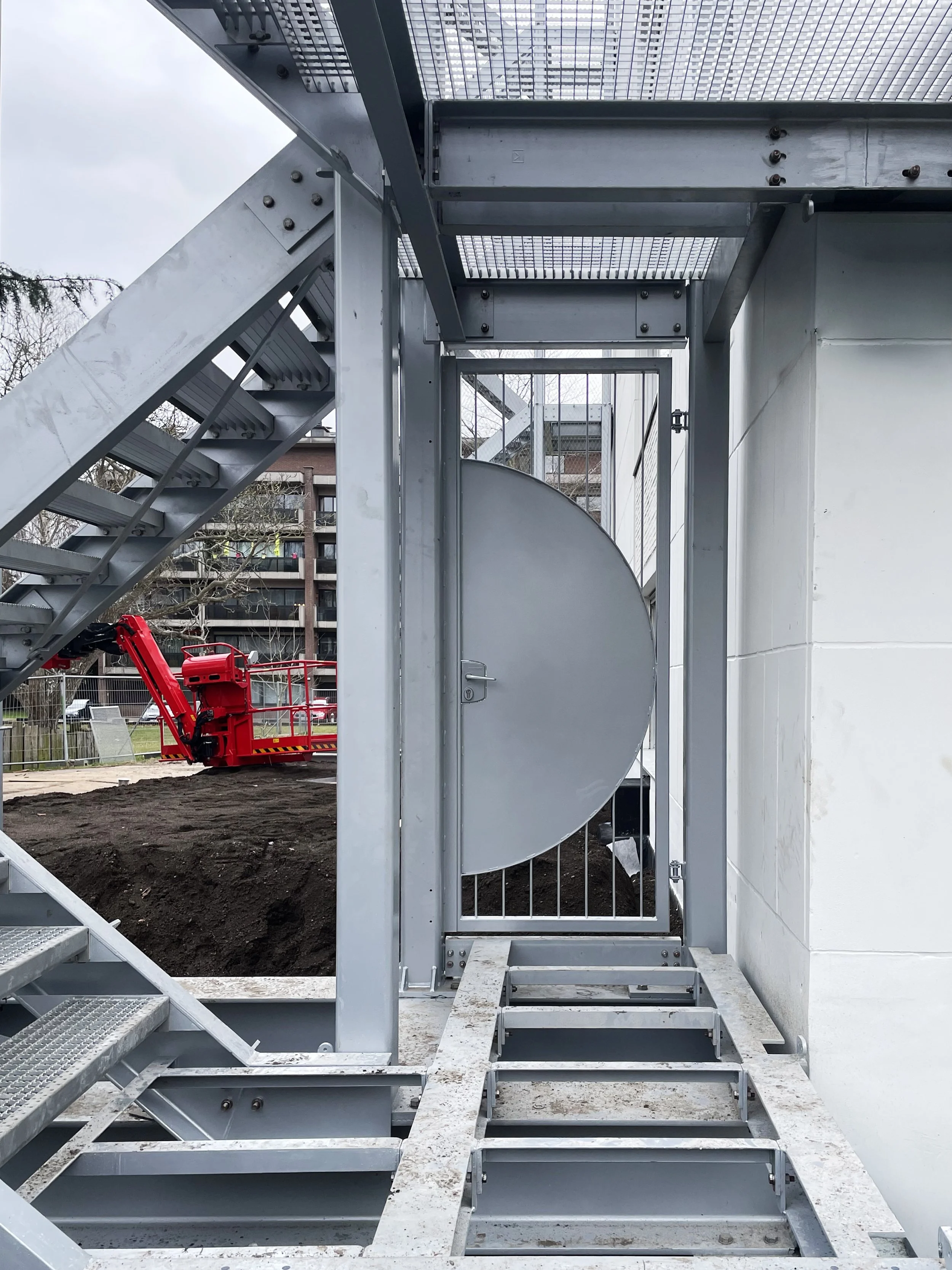 We approached the project as an opportunity to enhance the building and surrounding landscape while fulfilling the utilitarian brief. In addition to a total shell renovation, we designed a rounded metal box stair structure that adds fire escape routes cost-effectively and acts as an architectural insertion that lends a contemporary edge to the post-war building. The materials for the facade and stair are light and reflect the green colours of the surrounding landscape, blending and embedding the building with its context.