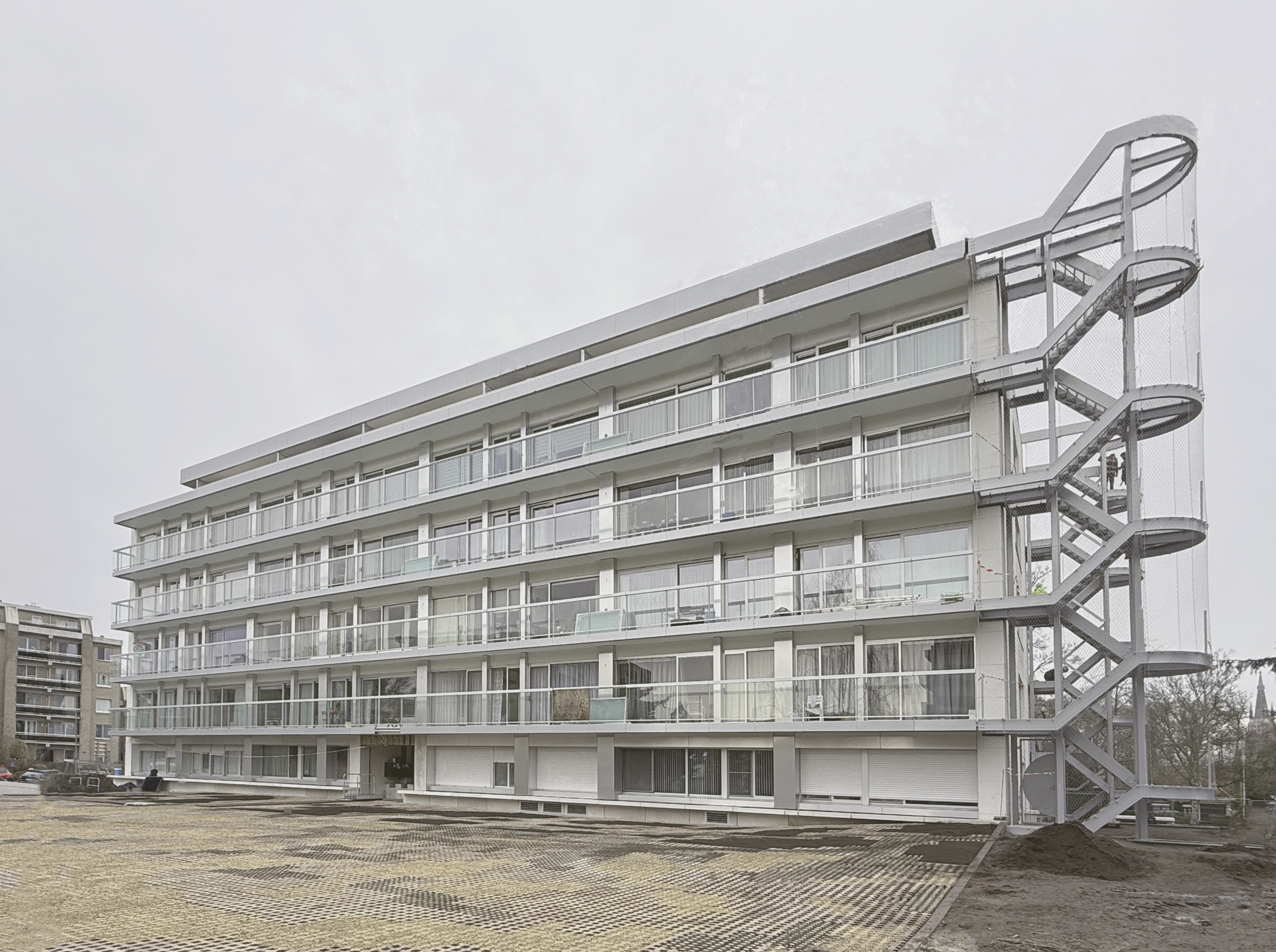 Our client for this project asked us to reinvigorate a crumbling post-war building situated along Brugge’s main canal. The damage was extensive, and the renovation also had to address new parking and fire safety ordinances that came into effect after the original construction. But, the canalside site had too much potential to turn it into a parking lot, and adding new fire stairs would require an expensive reconfiguration of the existing structure.